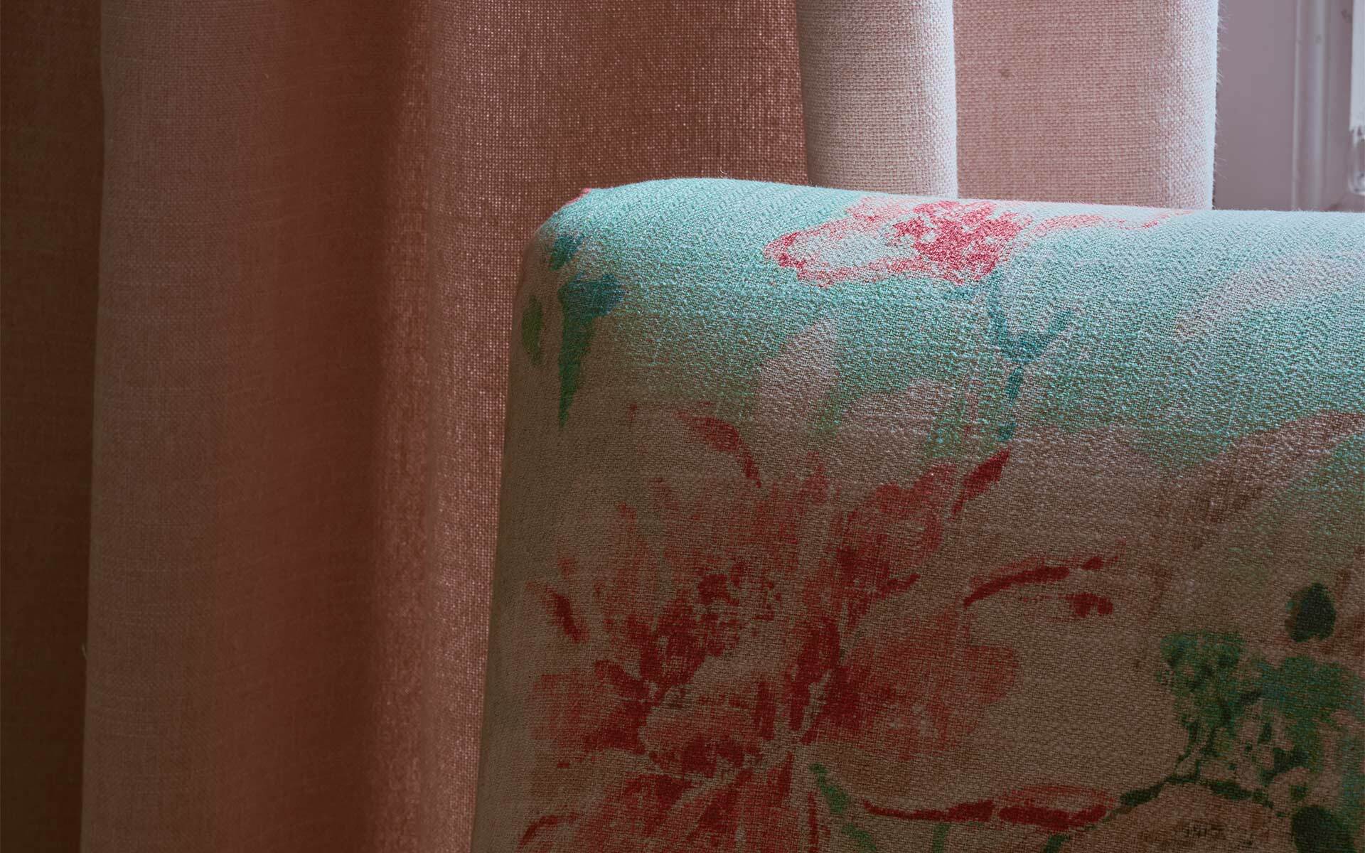 Camila combines the sweetness of a floral design with a herringbone base in cotton and linen. The mix of materials evoke the delicacy of antique fabrics. Available in three ranges, it is a versatile and enveloping fabric.