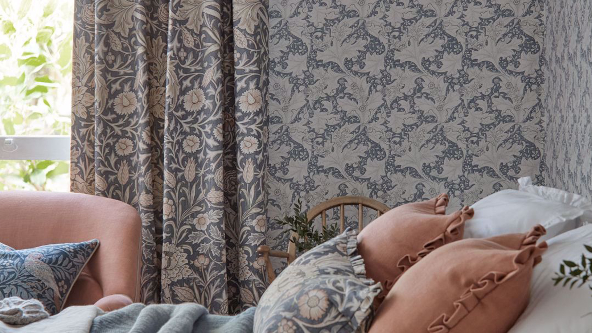 Trent, which began life in 1888 with the grand accolade of being Morris & Co.’s most expensive printed textile, is a rich, vibrant floral display. This luscious pattern features curving tulips and meandering acanthus leaves amongst other stalwarts of English gardens. Trent seamlessly imagines two of William Morris’s guiding design principles; ensnare the eye with sprawling repeats and beguile with masterfully rendered motifs.